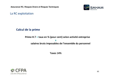 65 taux en % (pour cent) selon activité entreprise Taxes 14% Assurance RC, Risques Divers et Risques Techniques x salaires bruts imposables de l’ensemble du personnel La RC exploitation Calcul de la prime Prime H.T =