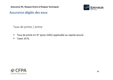 89 Assurance RC, Risques Divers et Risques Techniques Assurance dégâts des eaux Taux de prime / prime Taux de prime en %° (pour mille) applicable au capital assuré. Taxes 14 %.