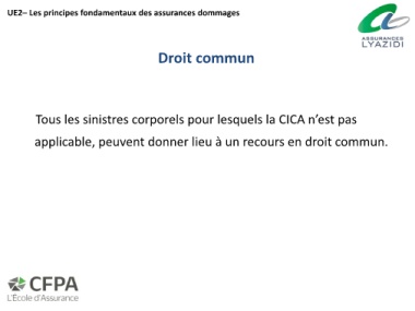 UE2– Les principes fondamentaux des assurances dommages Droit commun Tous les sinistres corporels pour lesquels la CICA n’est pas applicable, peuvent donner lieu à un recours en droit commun.