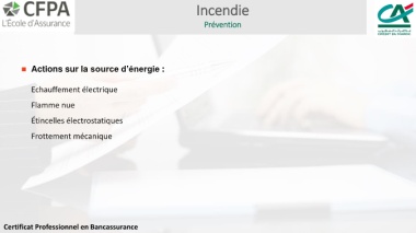 Incendie Prévention ◼ Actions sur la source d’énergie : Echauffement électrique Flamme nue Étincelles électrostatiques Frottement mécanique Certificat Professionnel en Bancassurance