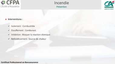 Incendie Prévention ◼ Interventions : ✓ Isolement : Combustible ✓ Etouffement : Comburant ✓ Inhibition : Bloquer la réaction chimique ✓ Refroidissement : Source de chaleur Certificat Professionnel en Bancassurance