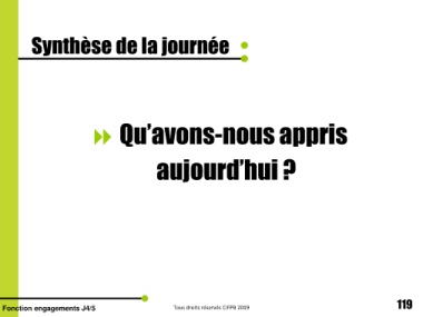 Synthèse de la journée Qu’avons-nous appris aujourd’hui ? 119 Fonction engagements J4/5 Tous droits réservés CIFPB 2019