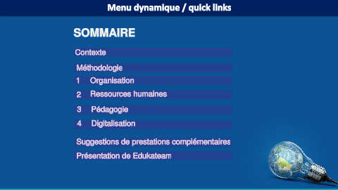 Menu dynamique / quick links SOMMAIRE Contexte Méthodologie 1 Organisation 2 Ressources humaines 3 Pédagogie 4 Digitalisation Suggestions de prestations complémentaires Présentation de Edukateam