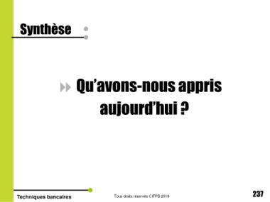 Synthèse Qu’avons-nous appris aujourd’hui ? 237 T Tous droits réservés CIFPB 2019 Techniques bancairesechniques bancaires