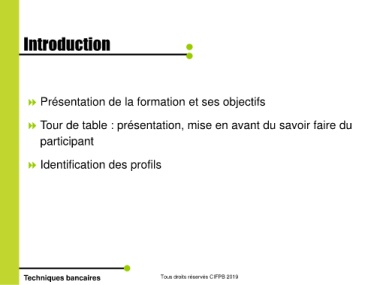 Introduction Présentation de la formation et ses objectifs Tour de table : présentation, mise en avant du savoir faire du participant Identification des profils Techniques bancaires Tous droits réservés CIFPB 2019