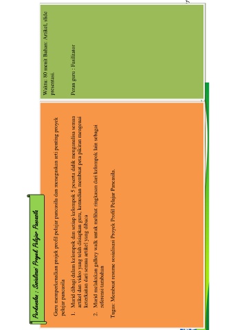 pelajar pancasila Murid dibagi dalam kelompok dan setiap kelompok 5 peserta didik menganalisa semua artikel dan video yang telah disiapkan guru, kemudian membuat peta pikiran mengenai keterkaitan dari semua artikel yang dibaca Murid melakukan gallery walk untuk melihat ringkasan dari kelompok lain sebagai referensi tambahan Tugas: Membuat resume sosialisasi Proyek Profil Pelajar Pancasila.