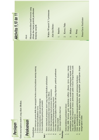 Aktivitas 9,10 dan 11 Mempresentasikan hasil resume yang dibuat dan lanjut praktek pembuatan kranjang sampah Waktu: 90 menit X 3 pertemuan Alat dan Bahan : Bambu Kawat, Paku Blakas Reng Peran Guru: Fasilitator
