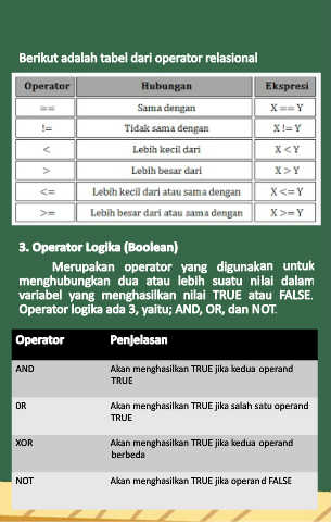 Operator logika ada 3, yaitu; AND, OR, dan NOT.