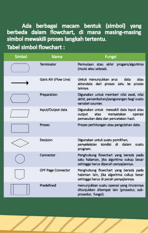 Ada berbagai macam bentuk (simbol) yang berbeda dalam flowchart, di mana masing-masing simbol mewakili proses langkah tertentu. Tabel simbol flowchart :