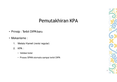 Pemutakhiran KPA • Prinsip : Terbit DIPA baru • Mekanisme : 1. Melalui Kanwil (revisi regular) 2. KPA : • Validasi ketat • Proses SPAN otomatis sampai terbit DIPA 19
