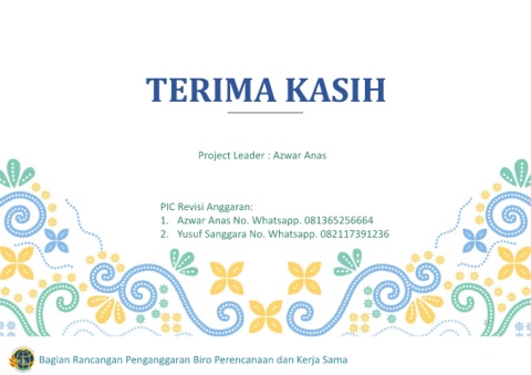 TERIMA KASIH Project Leader : Azwar Anas PIC Revisi Anggaran: 1. Azwar Anas No. Whatsapp. 081365256664 2. Yusuf Sanggara No. Whatsapp. 082117391236 21 Bagian Rancangan Penganggaran Biro Perencanaan dan Kerja Sama