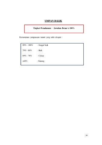 UMPAN BALIK Tingkat Pemahaman – Jawaban Benar x 100% Kemampuan penguasaan materi yang telah dicapai : 89% - 100% : Sangat baik 79% - 89% : Baik 69% - 78% : Cukup <68% : Kurang 24