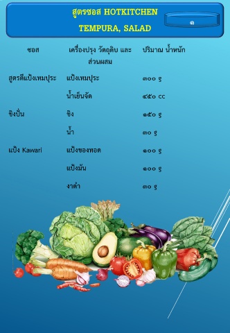 ู สตรซอส HOTKITCHEN 1 TEMPURA, SALAD ซอส เครื่องปรุง วัตถุดิบ และ ปริมาณ น ้าหนัก ส่วนผสม สูตรตีแป้งเทมปุระ แป้งเทมปุระ 300 g น ้าเย็นจัด 450 cc ขิงปั่น ขิง 150 g น ้า 30 g แป้ง Kawari แป้งของทอด 100 g แป้งมัน 100 g งาด้า 30 g