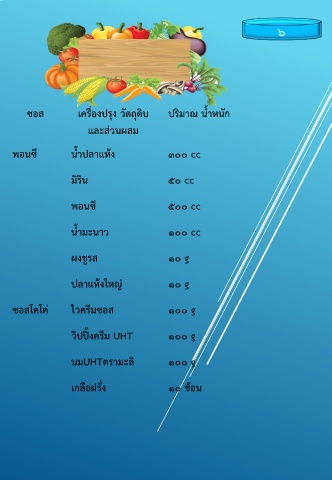 6 ซอส เครื่องปรุง วัตถุดิบ ปริมาณ น ้าหนัก และส่วนผสม พอนซึ น ้าปลาแห้ง 300 cc มิริน 50 cc พอนซึ 500 cc น ้ามะนาว 100 cc ผงชูรส 10 g ปลาแห้งใหญ่ 10 g ซอสโคโค่ ไวครีมซอส 100 g วิปปิ้งครีม UHT 100 g นมUHTตรามะลิ 100 g เกลือฝรั่ง 10 ช้อน