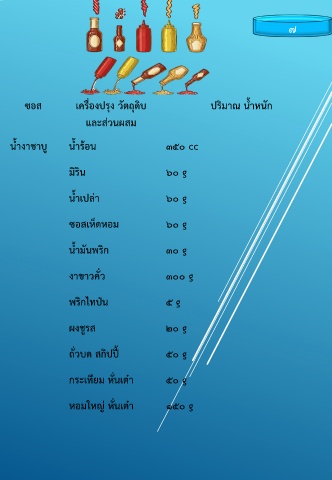 7 ซอส เครื่องปรุง วัตถุดิบ ปริมาณ น ้าหนัก และส่วนผสม น ้างาชาบู น ้าร้อน 350 cc มิริน 60 g น ้าเปล่า 60 g ซอสเห็ดหอม 60 g น ้ามันพริก 30 g งาขาวคั่ว 300 g พริกไทป่น 5 g ผงชูรส 20 g ถั่วบด สกิปปี้ 50 g กระเทียม หั่นเต๋า 50 g หอมใหญ่ หั่นเต๋า 150 g