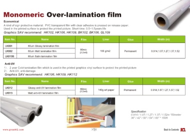 LK002               80um Matt lamination film                                       100 g/m2             Permanent               0.914,1.07,1.27,1.37,1.52
