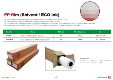 PPS200-H Quick-dry Solvent ink PP film (Satin surface̶ PP 200mic ECO, Solvent