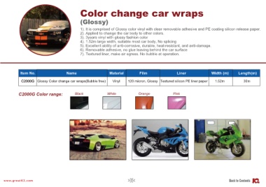 C2000G Glossy Color change car wraps(Bubble free)        Vinyl     120 micron, Glossy Textured silicon PE liner paper     1.52m             30m