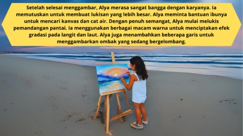 untuk mencari kanvas dan cat air. Dengan penuh semangat, Alya mulai melukis