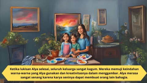 Ketika lukisan Alya selesai, seluruh keluarga sangat kagum. Mereka memuji keindahan warna-warna yang Alya gunakan dan kreativitasnya dalam menggambar. Alya merasa sangat senang karena karya seninya dapat membuat orang lain bahagia.