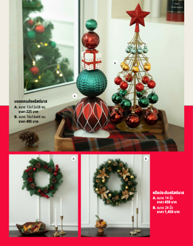 B. A. บอลตกแต่งคริสต์มาส A. ขนาด 12x12x38 ซม. ราคา 225 บาท ขนาด 16x16x44 ซม. ราคา 495 บาท B. A. B. หรีดประดับคริสต์มาส A. ขนาด 14 นิ้ว ราคา 450 บาท B. ขนาด 24 นิ้ว ราคา 1,450 บาท
