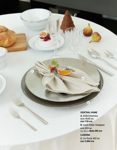 C. A. B. CENTRAL HOME A. ผ้าเช็ดปากคอตตอน ขนาด 45x45 ซม. ราคา 110 บาท B. จานแก้ Platter Snowglass ขนาด Ø33 ซม. ราคา 450 บาท พิเศษ 295 บาท LUZERNE C. จาน Platter Ø32 ซม. ราคา 5,900 บาท
