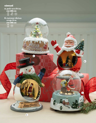 กล่องดนตรี A. ลูกแก้ว ขนาด Ø14 ซม. ราคา 890 บาท B. ซานตาครอส /สโนว์แมน ความสูง 20 ซม. ราคา 890 บาท A. B. A. B.