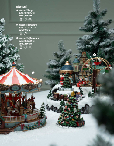 กล่องดนตรี A. กล่องดนตรีม้าหมุน ขนาด 28x29x26 ซม. ราคา 3,590 บาท B. กล่องดนตรีต้นคริสต์มาส ขนาด 12x12x14.5 ซม. ราคา 790 บาท C. กล่องดนตรีหมู่บ้านสวนสนุก ขนาด 33x26x29 ซม. ราคา 2,590 บาท C. A. B.