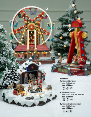 A. C. B. กล่องดนตรี A. กล่องดนตรีชิงช้าสวรรค์ ขนาด 29x24x33 ซม. ราคา 3,590 บาท B. กล่องดนตรีเครื่องเล่น PANDULUM ขนาด 26x 24x28 ซม. ราคา 2,290 บาท C. กล่องดนตรีหมู่บ้านซานตาครอส ขนาด 23x21x20 ซม. ราคา 1,590 บาท