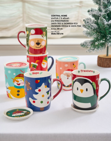 CENTRAL HOME ชุดแก้วมัก 2 ใบ พร้อมฝา ลาย PENQUIN&BEAR/ SANTA TREE & SNOWMAN RED/ SNOWMAN ORANGE & SANTA PINK ความจุ 380 มล.ราคา 595 บาท พิเศษ 350 บาท