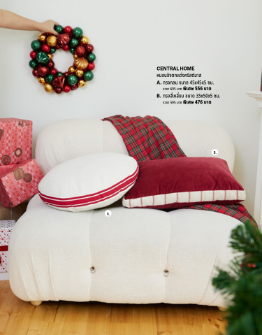 A. CENTRAL HOME หมอนอิงตกแต่งคริสต์มาส A. B. ทรงกลม ขนาด 45x45x5 ซม. ราคา 695 บาท พิเศษ 556 บาท ทรงสี่เหลี่ยม ขนาด 35x50x5 ซม. ราคา 595 บาท พิเศษ 476 บาท B.