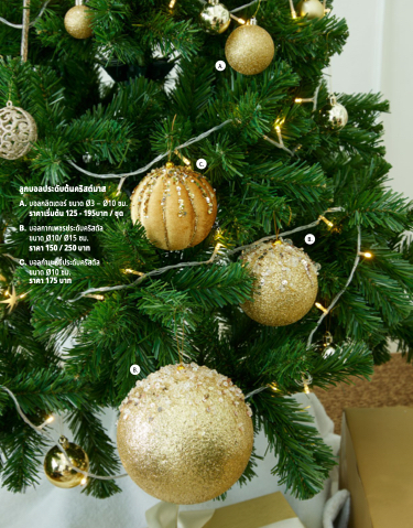 A. C. ลูกบอลประดับต้นคริสต์มาส A. B. C. บอลกลิตเตอร์ ขนาด Ø3 – Ø10 ซม. ราคาเริ่มต้น 125 - 195บาท / ชุด บอลกากเพชรประดับคริสตัล ขนาด Ø10/ Ø15 ซม. ราคา 150 / 250 บาท บอลกำมะหยี่ประดับคริสตัล ขนาด Ø10 ซม. ราคา 175 บาท B. B.