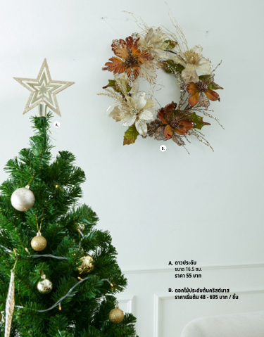 A. B. A. ดาวประดับ ขนาด 16.5 ซม. ราคา 55 บาท B. ดอกไม้ประดับต้นคริสต์มาส ราคาเริ่มต้น 48 - 695 บาท / ชิ้น
