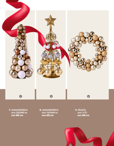 F. F. บอลตกแต่งคริสต์มาส ขนาด 20x20x40 ซม. ราคา 995 บาท G. G. บอลตกแต่งคริสต์มาส ขนาด 16x16x44 ซม. ราคา 495 บาท H. H. หรีดประดับ ขนาด 14 นิ้ว ราคา 590 บาท