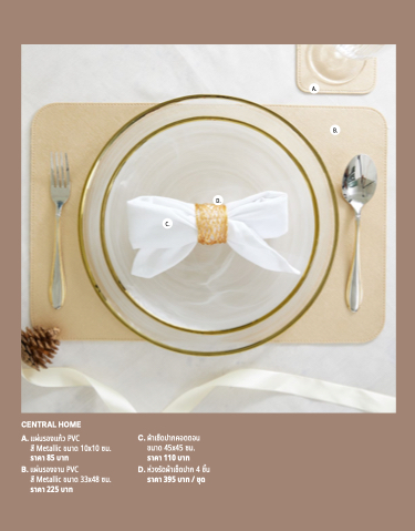 A. B. D. C. CENTRAL HOME A. แผ่นรองแก้ว PVC สี Metallic ขนาด 10x10 ซม. ราคา 85 บาท B. แผ่นรองจาน PVC สี Metallic ขนาด 33x48 ซม. ราคา 225 บาท C. ผ้าเช็ดปากคอตตอน ขนาด 45x45 ซม. ราคา 110 บาท D. ห่วงรัดผ้าเช็ดปาก 4 ชิ้น ราคา 395 บาท / ชุด