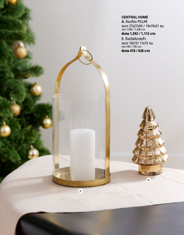 CENTRAL HOME A. โคมเทียน PILLAR ขนาด 27x27x50 / 19x19x31 ซม. ราคา 1,990 / 1,390 บาท พิเศษ 1,592 / 1,112 บาท B. ต้นคริสต์มาสแก้ว ขนาด 10x15/ 11x15 ซม. ราคา 595 / 795 บาท พิเศษ 476 / 636 บาท B. A.