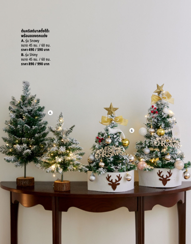 ต้นคริสต์มาสตั้งโต๊ะ พร้อมของตกแต่ง A. รุ่น Snowy ขนาด 45 ซม. / 60 ซม. ราคา 490 / 590 บาท B. รุ่น Shiny ขนาด 45 ซม. / 60 ซม. ราคา 890 / 990 บาท A. B.