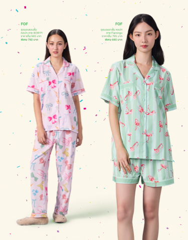 FOF FOF ชุดนอนแขนสั้น คอปก ลาย BOW PI ราคาเต็ม 995 บาท พิเศษ 795 บาท ชุดนอนขาสั้น คอปก ลาย Flamingo ราคาเต็ม 795 บาท พิเศษ 695 บาท