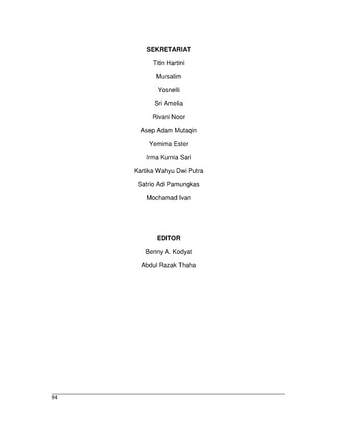 SEKRETARIAT Titin Hartini Mursalim Yosnelli Sri Amelia Rivani Noor Asep Adam Mutaqin Yemima Ester Irma Kurnia Sari Kartika Wahyu Dwi Putra Satrio Adi Pamungkas Mochamad Ivan EDITOR Benny A. Kodyat Abdul Razak Thaha 94