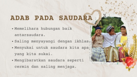 ADAB PADA SAUDARA Memelihara hubungan baik antarsaudara. Saling menyayangi dengan ikhlas. Menyukai untuk saudara kita apa yang kita sukai. Mengibaratkan saudara seperti cermin dan saling menjaga.