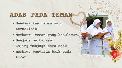 ADAB PADA TEMAN Mendamaikan teman yang berselisih. Membantu teman yang kesulitan. Menjaga perkataan. Saling menjaga nama baik. Membawa pengaruh baik pada teman.