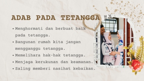 ADAB PADA TETANGGA Menghormati dan berbuat baik pada tetangga. Bangunan rumah kita jangan mengganggu tetangga. Memelihara hak-hak tetangga. Menjaga kerukunan dan keamanan. Saling memberi nasihat kebaikan.