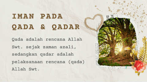 IMAN PADA QADA & QADAR Qada adalah rencana Allah Swt. sejak zaman azali, sedangkan qadar adalah pelaksanaan rencana (qada) Allah Swt.