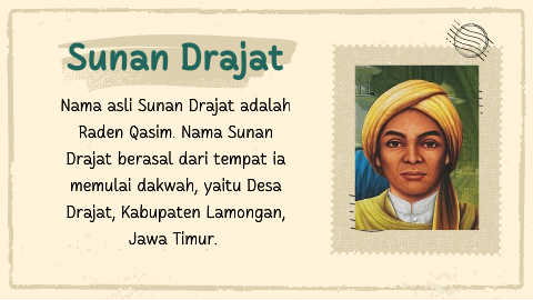 Sunan Drajat Nama asli Sunan Drajat adalah Raden Qasim. Nama Sunan Drajat berasal dari tempat ia memulai dakwah, yaitu Desa Drajat, Kabupaten Lamongan, Jawa Timur.