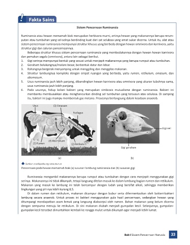 Pencernaan pada hewan memamah biak (a) susunan lambung ruminansia dan (b) susunan gigi
