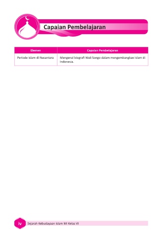 Capaian Pembelajaran Elemen Capaian Pembelajaran Periode Islam di Nusantara Mengenal biografi Wali Songo dalam mengembangkan Islam di Indonesia. iv Sejarah Kebudayaan Islam MI Kelas VI