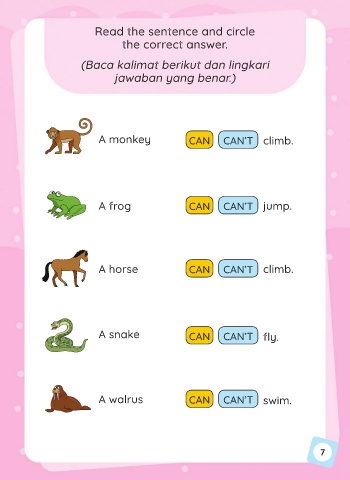 Read the sentence and circle the correct answer. (Baca kalimat berikut dan lingkari jawaban yang benar.) A monkey CAN CAN’T climb. A frog CAN CAN’T jump. A horse CAN CAN’T climb. A snake CAN CAN’T fly. A walrus CAN CAN’T swim. 7