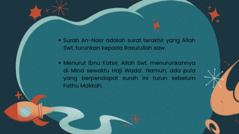 Surah An-Nasr adalah surat terakhir yang Allah Swt. turunkan kepada Rasulullah saw. Menurut Ibnu Katsir, Allah Swt. menurunkannya di Mina sewaktu Haji Wada’. Namun, ada pula yang berpendapat surah ini turun sebelum Fathu Makkah.