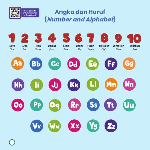 Scan barcode untuk menonton Angka dan Huruf video animasi. (Number and Alphabet) Satu Dua Tiga Empat Lima Enam Tujuh Delapan Sembilan Sepuluh One Two Three Four Five Six Seven Eight Nine Ten 1