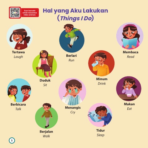 Scan barcode Hal yang Aku Lakukan untuk menonton video animasi. (Things I Do) Tertawa Membaca Laugh Berlari Read Run Duduk Minum Sit Drink Berbicara Makan Talk Menangis Eat Cry Berjalan Tidur Walk Sleep 5
